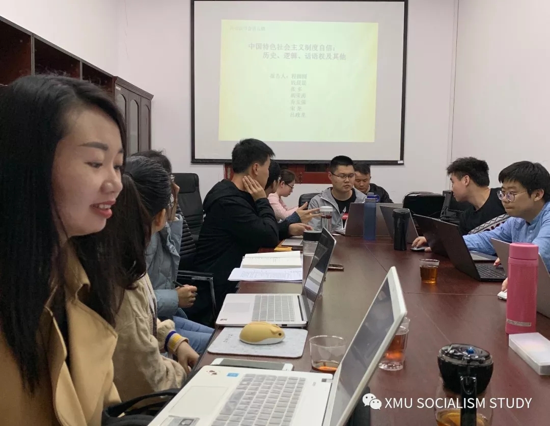 上半场读书分享的共性在于都聚焦于制度建设,多视角研究制度自信问题。关于“如何阐发马克思主义经典原著的当代意义”的问题,杨旭博士后认为要回到经典著作中去,进行深入挖掘,同时也应避免对文本进行过度解读,不要以自己的想法去裁剪文本、以自己期望获得的论据去改造文本。针对有同学提出“马克思主义政党”这一概念的使用问题,老师的建议是:回到原著中,通过搜索马克思恩格斯关于政党的定语运用,即何谓“工人阶级政党”,然后再具体分析“工人阶级政党”与当今耳熟能详的“马克思主义政党”在内涵与外沿上的联系与区别,因为人们在文本解读中非常容易陷入一个误区,即用今天人人熟知的表达方式去描述作者的思想。杨旭博士后还指出,话语权问题实际上更接近制度自信的本质,目前制度自信的相关研究中对如何将客观条件转化为主观心理状态方面的分析还很不足,大家应当避免这种主观客观相分离的错误。