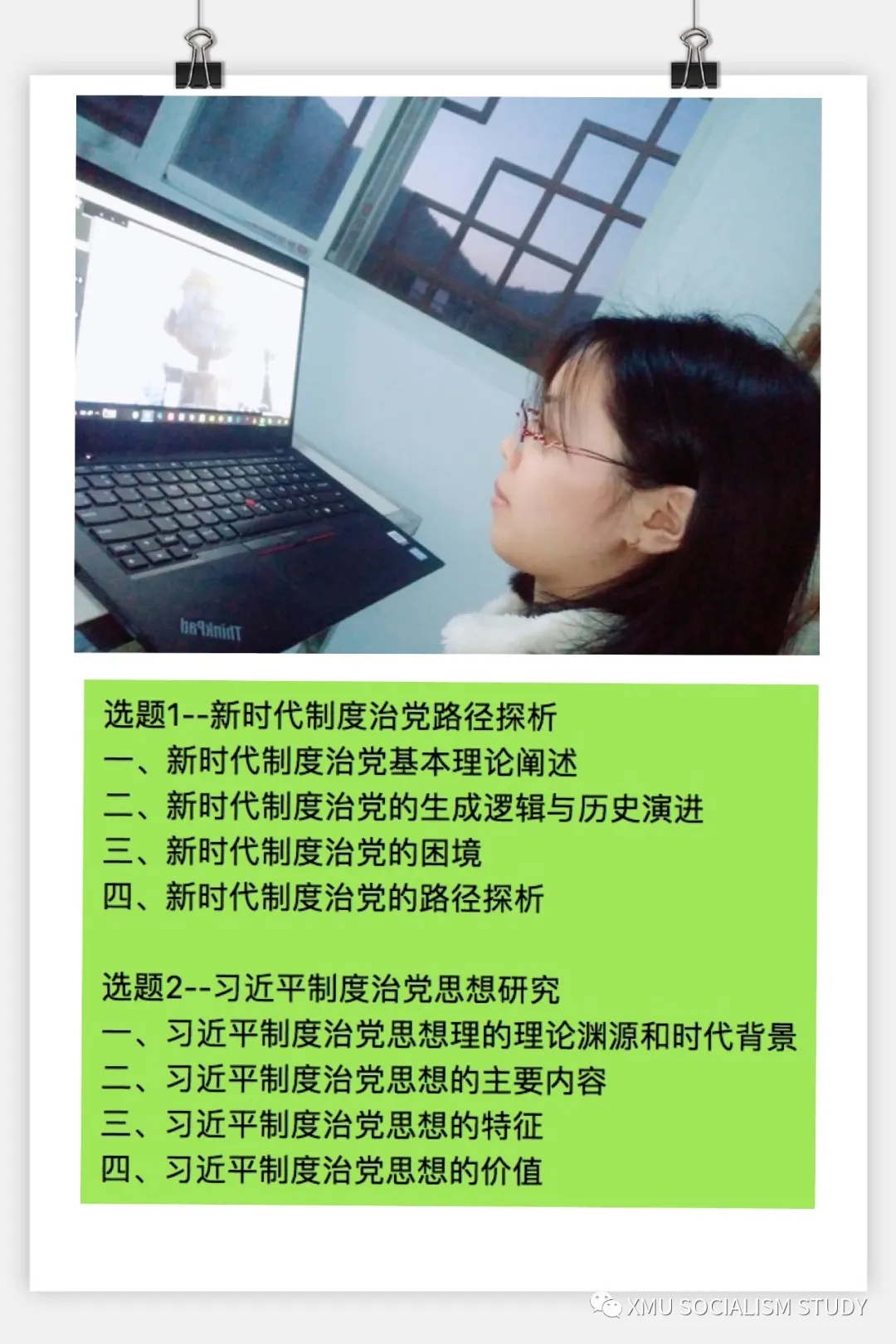 选题1一定要卡准"新时代"这一核心词,所列框架要紧扣"制度治党"这个主题,也可选择一个具体角度切入,所有这些都建立在广泛阅读制度治党相关文献、积累一定阅读量的基础上。具体建议包括: