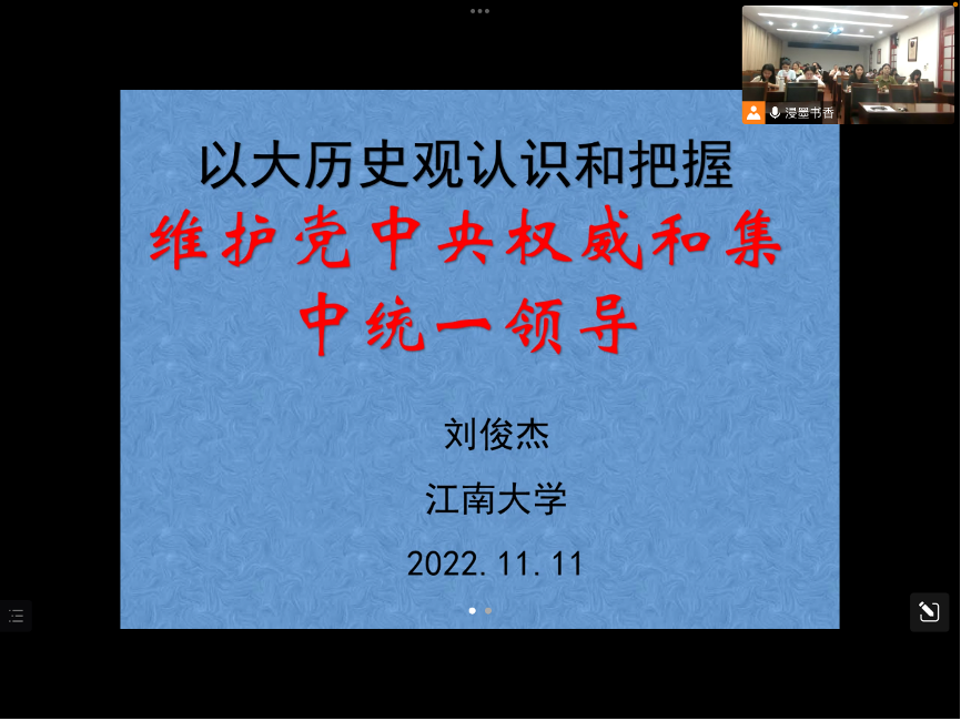 为深入学习贯彻党的二十大精神,11月11日,厦门大学中国特色社会主义研究中心特邀江南大学“至善青年学者”刘俊杰教授作了题为“以大历史观认识和把握‘维护党中央权威和集中统一领导’”学术讲座。本次讲座采取线下线上相结合的方式举行,马克思主义学院李建助理教授主持讲座。